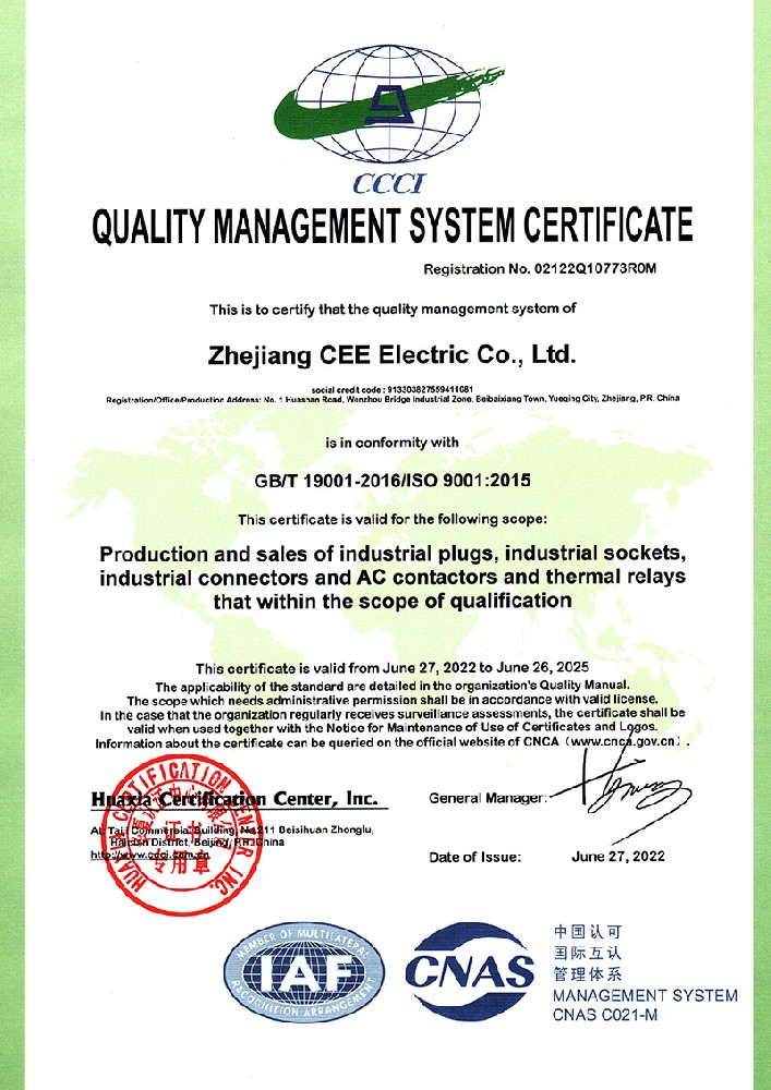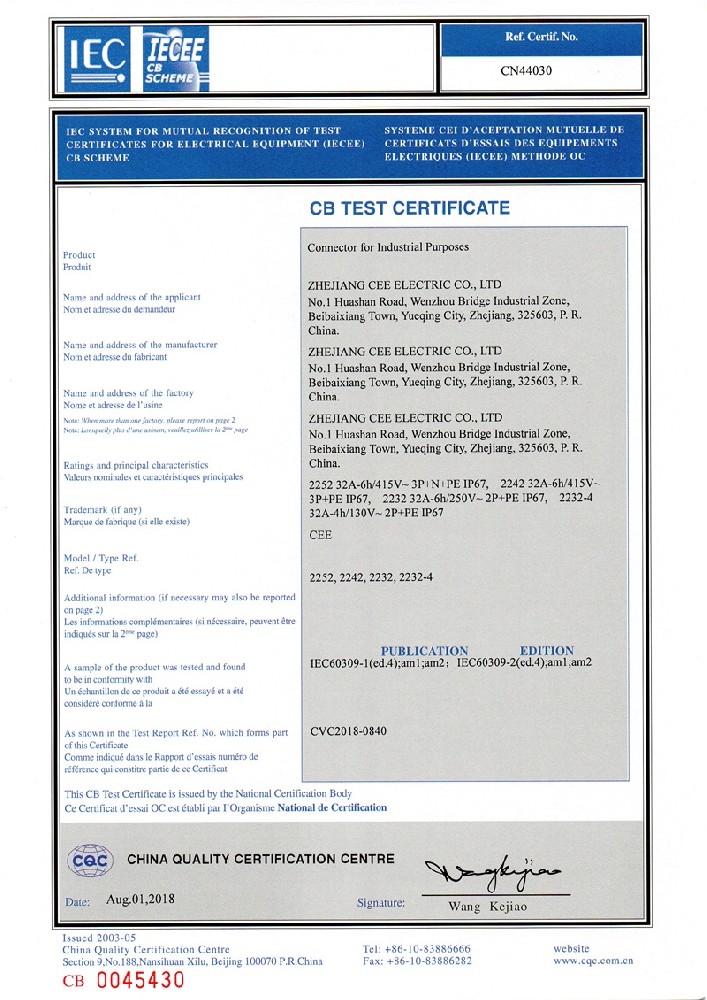公司全面貫徹實(shí)施IS09001:2015質(zhì)量管理體系認(rèn)證。工業(yè)插頭插座符合IEC 603 09-1-2, EN 60 309-1-2國(guó)際標(biāo)準(zhǔn), 組合插座箱符合EN61439標(biāo)準(zhǔn),并通過(guò)Intertek & TUV Rheinland & CQC等認(rèn)證。證書包括TUV、SEMKO、CE、CB、EAC,并符合RoHS和Reach等適用法規(guī)。公司引進(jìn)先進(jìn)生產(chǎn)設(shè)備和精密檢測(cè)試驗(yàn)儀器、不斷引入高科技工藝流程和技術(shù)人才,為公司的產(chǎn)品研發(fā)、質(zhì)量升級(jí)、管理創(chuàng)新提供了強(qiáng)有力的保障。公司將持續(xù)以優(yōu)質(zhì)的產(chǎn)品和服務(wù),贏得客戶的最大滿意為宗旨,發(fā)揚(yáng)“創(chuàng)新、服務(wù)、溝通”的企業(yè)精神,力促CEE品牌從中國(guó)走向世界。我們牢牢把握時(shí)代賦予的使命和機(jī)遇,與海內(nèi)外合作伙伴共同開創(chuàng)事業(yè)的新高度。